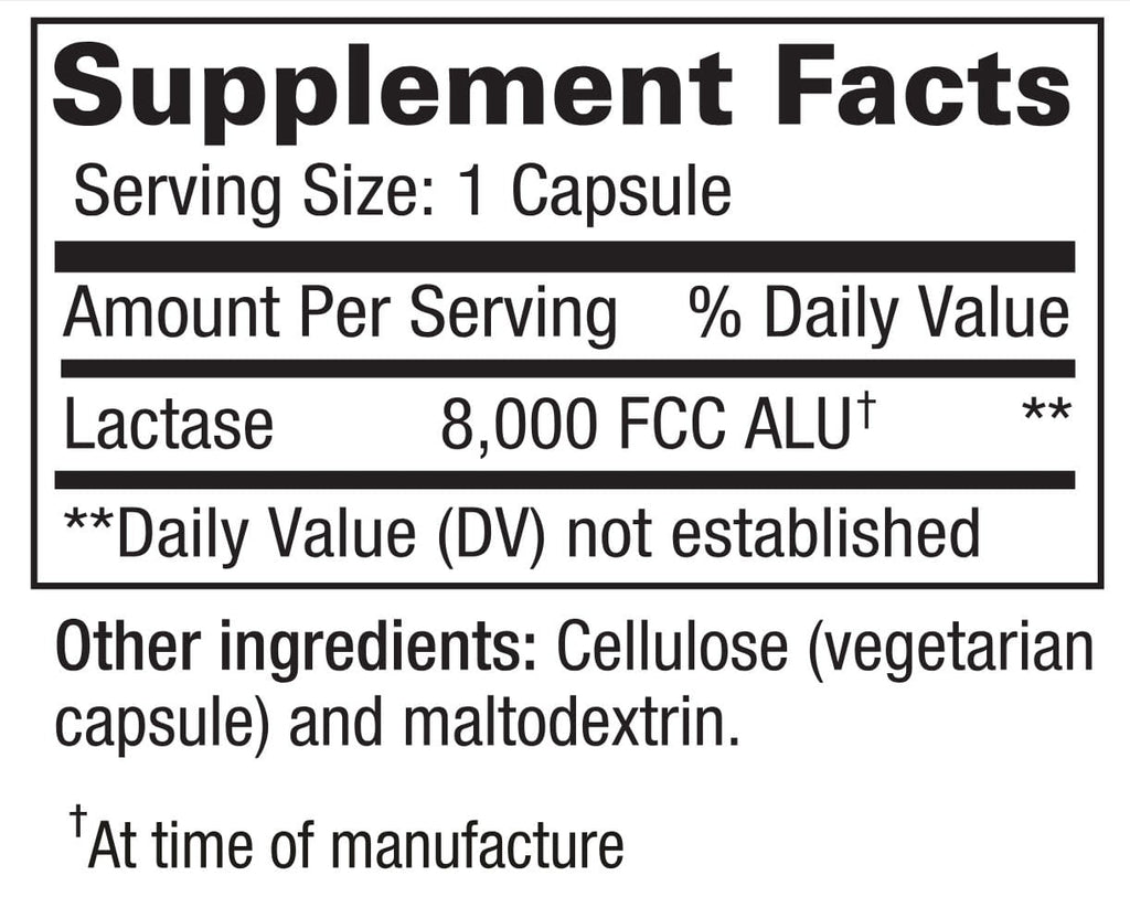 Each vegetarian capsule provides 8,000 FCC ALU of lactase, making it an effective option for supporting digestion before consuming milk, cheese, ice cream, or other dairy-containing foods.