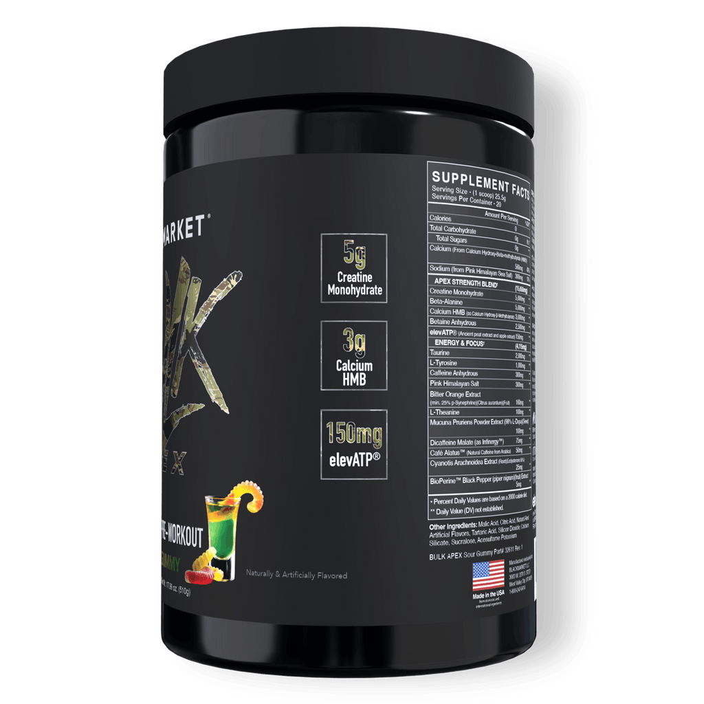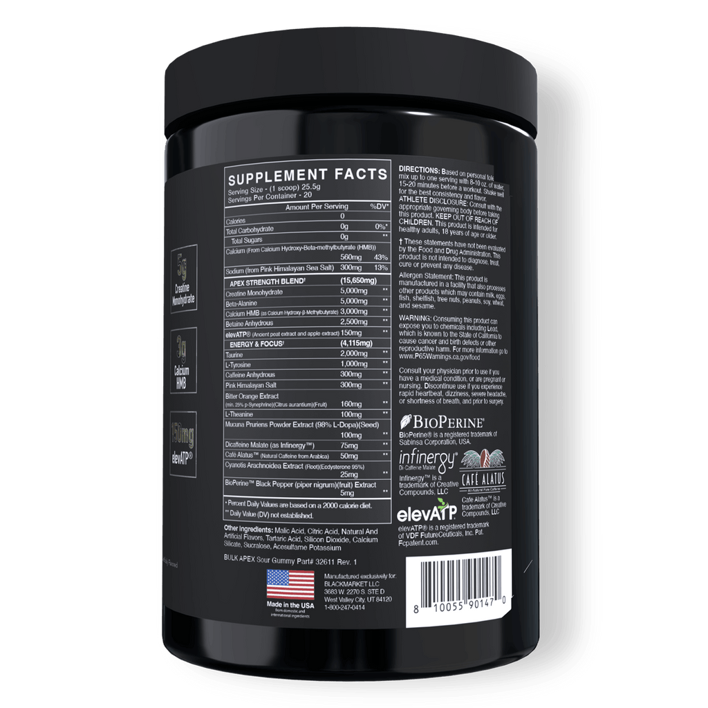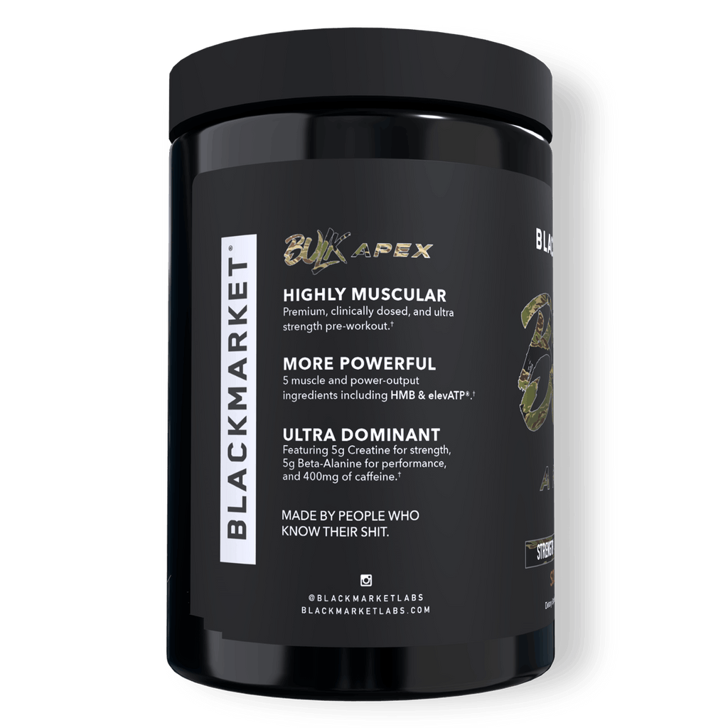 PURPOSE: BULK APEX is our most powerful strength-based pre-workout. Engineered to maximize ATP production, force output, neuromuscular drive, and muscle preservation. This is the formula for lifters, and weight trainers who are looking to support muscle size, raw output, and dominant performance.*