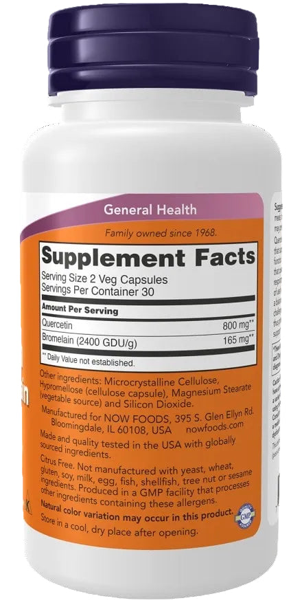 NOW Foods Quercetin with Bromelain combines two well-researched compounds to support healthy immune function and year-round respiratory comfort.* Quercetin is a naturally occurring flavonoid and powerful antioxidant that helps neutralize free radicals while supporting a balanced seasonal immune response.* Laboratory research also suggests quercetin may help promote normal respiratory function during seasonal challenges.*